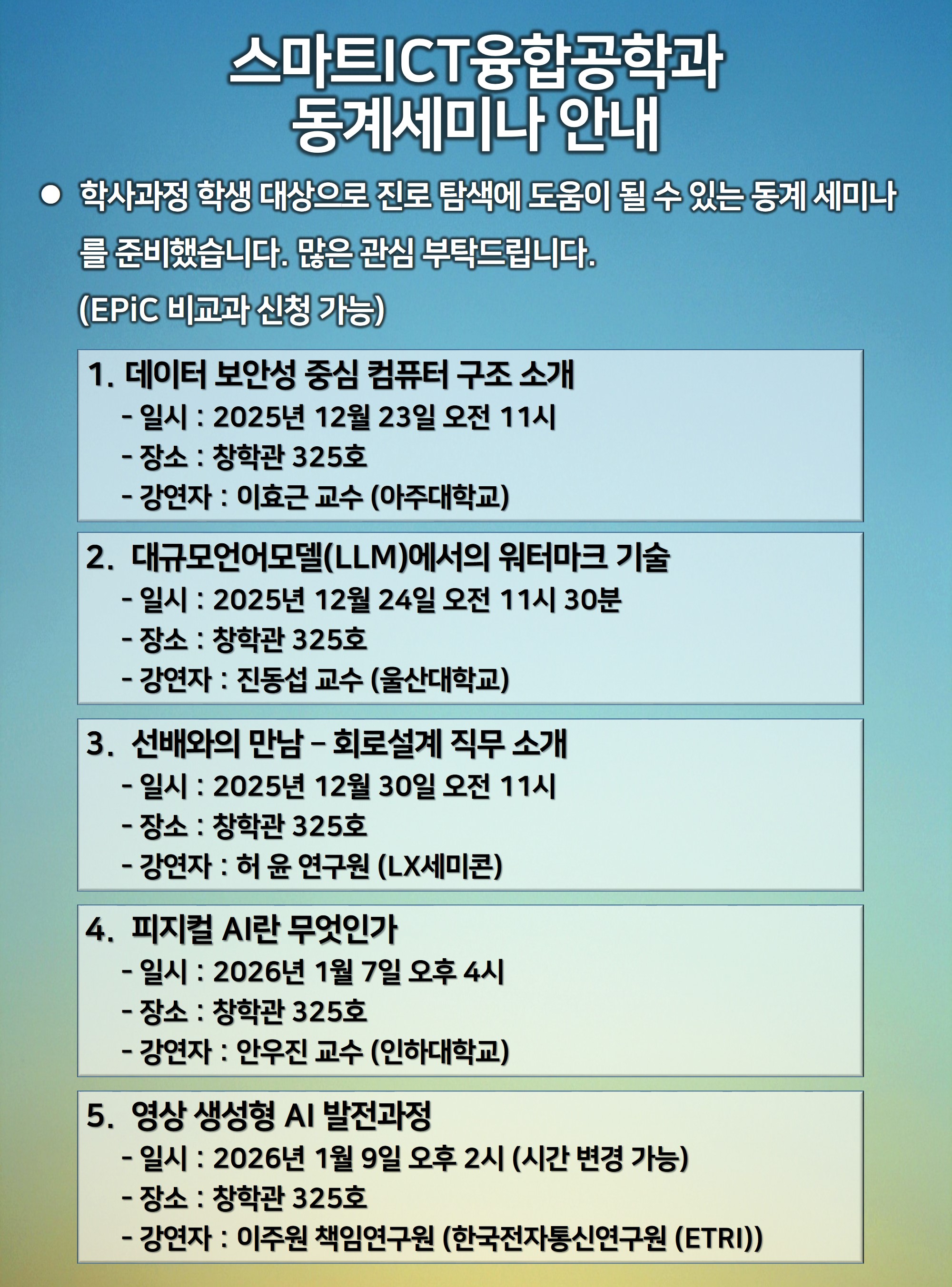 스마트ICT융합공학과에서는 학부생 진로탐색에 도움을 주고자 '동계 세미나'를 아래와 같이 개최합니다. 학부생 여러분들의 많은 관심 부탁 드립니다.