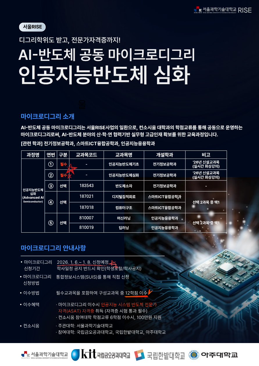 1. 학 위 명: AI-반도체 공동 마이크로디그리 인공지능반도체 심화 2. 마이크로디그리 신청기간: 2026. 1. 6. ~ 1. 8. ※ 학사일정에 따라 변동 가능성 있음 3. 주 관: 서울과학기술대학교 RISE사업단 ※ 컨소시움 대학: 국립금오공과대학교, 국립한밭대학교, 아주대학교 4. 이수학점: 필수과목을 포함하여 구성교과목 중 12학점 이수 5. 교육과정 편성내역
